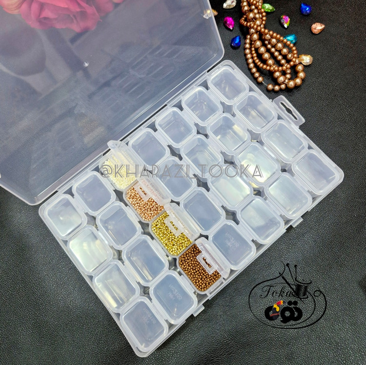 جعبه ۲۸ خونه با ۲۸ درب جداگانه هر خانه حدود ۲۰ گرم منجوق فضا دارد