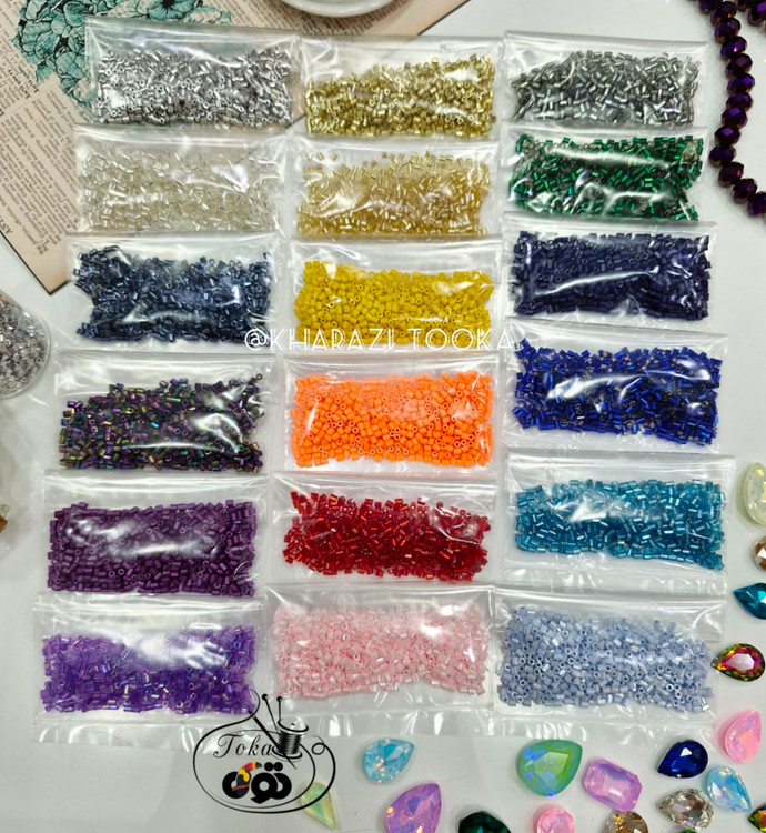 پک اقتصادی و با صرفه ملیله شکسته Fgb در رنگهای متنوع ۱۸ رنگ ملیله شکسته متفاوت گچی، شیشه ای، متالیک از هر رنگ ۵ گرم