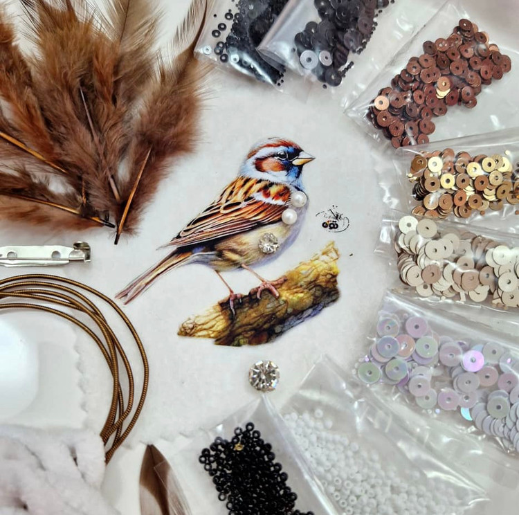 تعداد: پولک، منجوق هر کدام حدود ۲ گرم، بلرسان، مروارید شل، کاموا مخمل، پر، نگین، سنجاق پیکسل