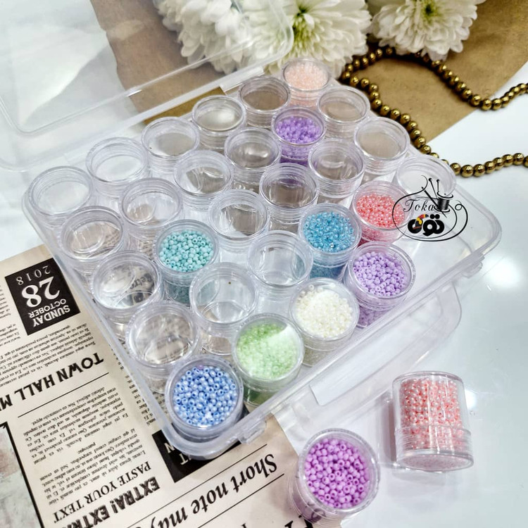 جعبه ۳۰ خونه که داخلش ۳۰ تا ظرف با درب های جداگانه دارد و هر ظرفی حدود ۱۰ گرم منجوق ظرفیت دارد