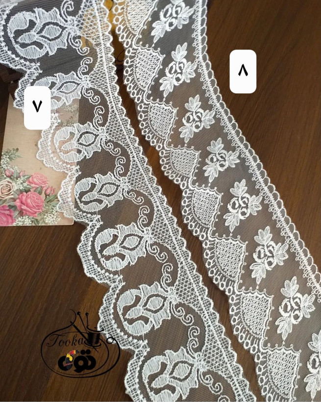 متاسفانه این کالا در حال حاضر موجود نیست. میتوانید از طریق لیست بالای صفحه، از محصولات مشابه این کالا دیدن نمایید.تور پهن سفید عرض ۹ سانتیمتر برای لبه ی آستین، یقه، لباس ، مانتو، جانماز، رومیزی