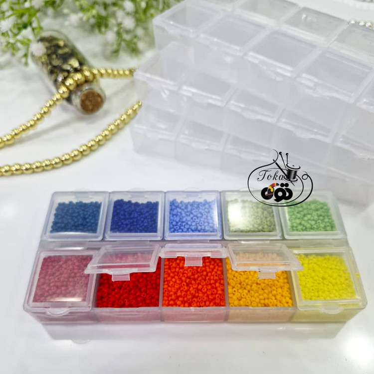 جنس: پلاستیک با کیفیت هر خونه درب جداگانه دارد و حدود ۱۰ گرم گنجایش منجوق دارد