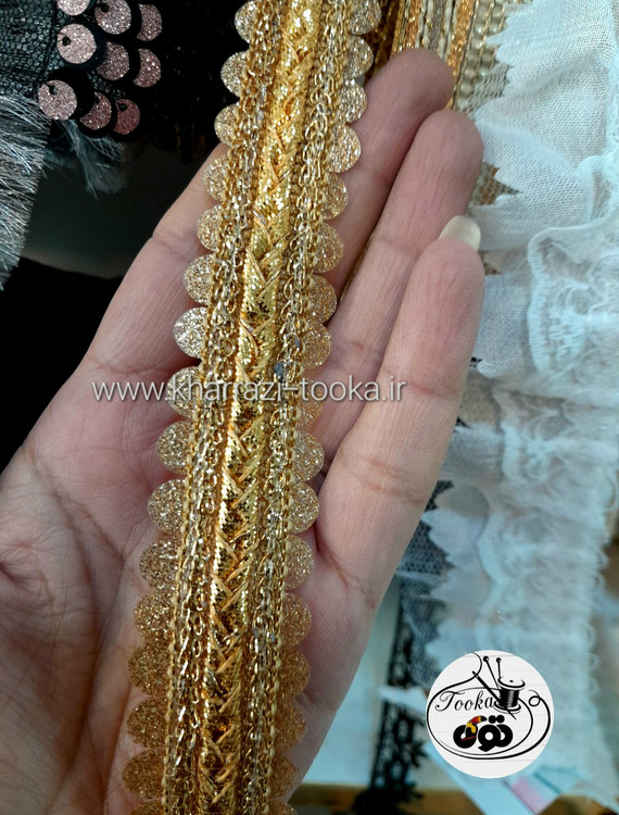 یراق پولک طلایی، خرجکار یا نوار برای تزئین انواع لباس، لباس مجلسی، مانتو، رومیزی، کیف، کفش، پرده، کوسن، سرویس خواب و ... استفاده می شود